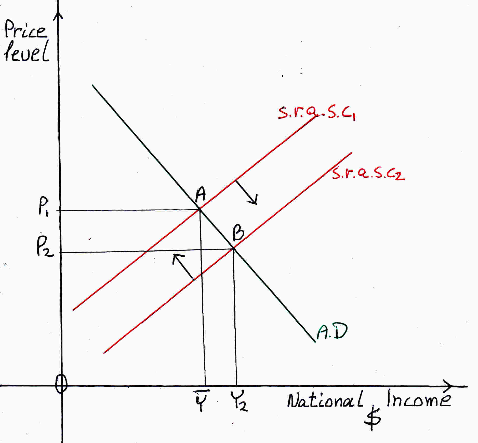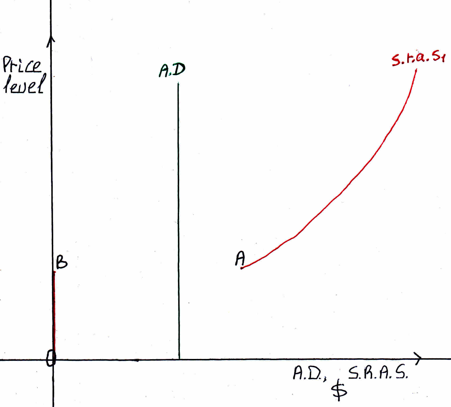At the above graph there is inconsistency: point A the s.r.a.s.c. does not meet the A.D. curve. There is excess supply. When there is excess supply the prices fall. When prices fall below A the supply curve moves from point A to point B. What that means is that supply moves to zero, firms not having at least their average variable costs covered stop production they are closing down there is a movement: a arrow (please, see figure below). When firms are closing down unemployment increases demand for raw materials decrease. Wages and prices decrease therefore the supply curve falls there is a movement: b arrow. The result is a diagonal movement of the s.r.a.s.c. from point A to point E. At point E prices fell and output fell. This is what happened during the Great Depression in U.S.A. and to a lesser effect in Germany and Japan in 2009.