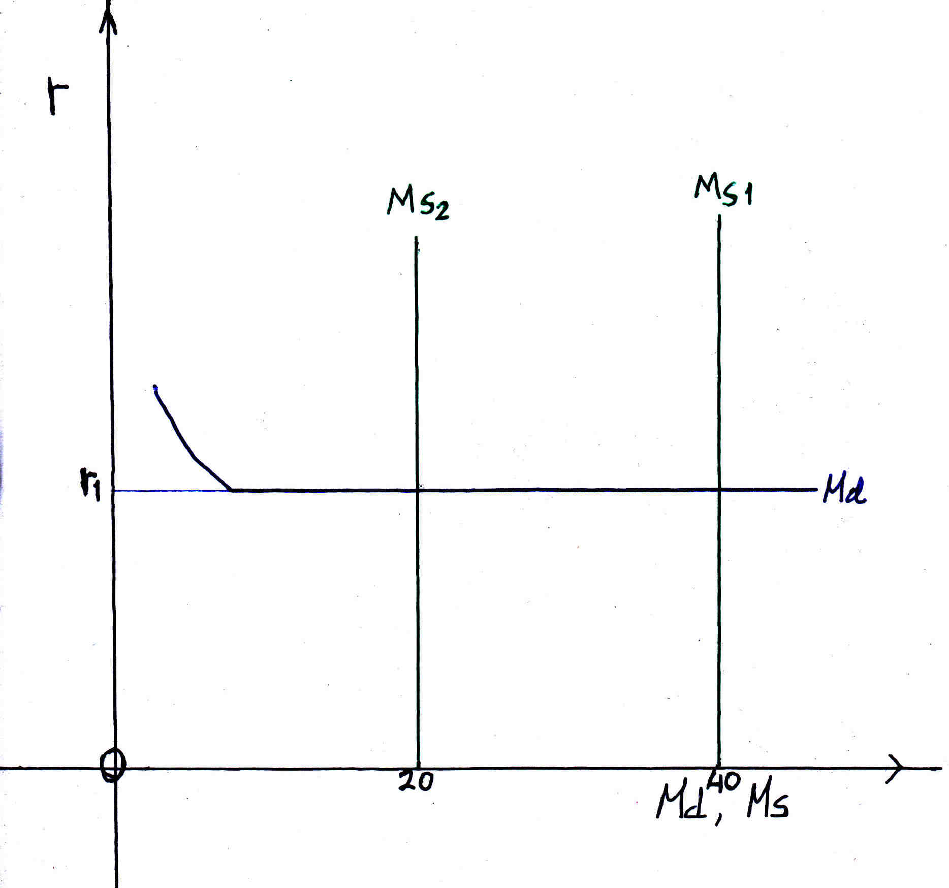 At liquidity trap the money demand curve (Md) is flat as money demand changes the rate of interest is the same r1. The money supply curve MS does not change with interest rate changes in fact the rate of interest does not have an effect on money supply it remains the same: 40. Suppose we have an increase in prices the real money supply decreases because real money supply= M/P= 40 where P is the price. If prices double then real money supply= M/2P= 20.