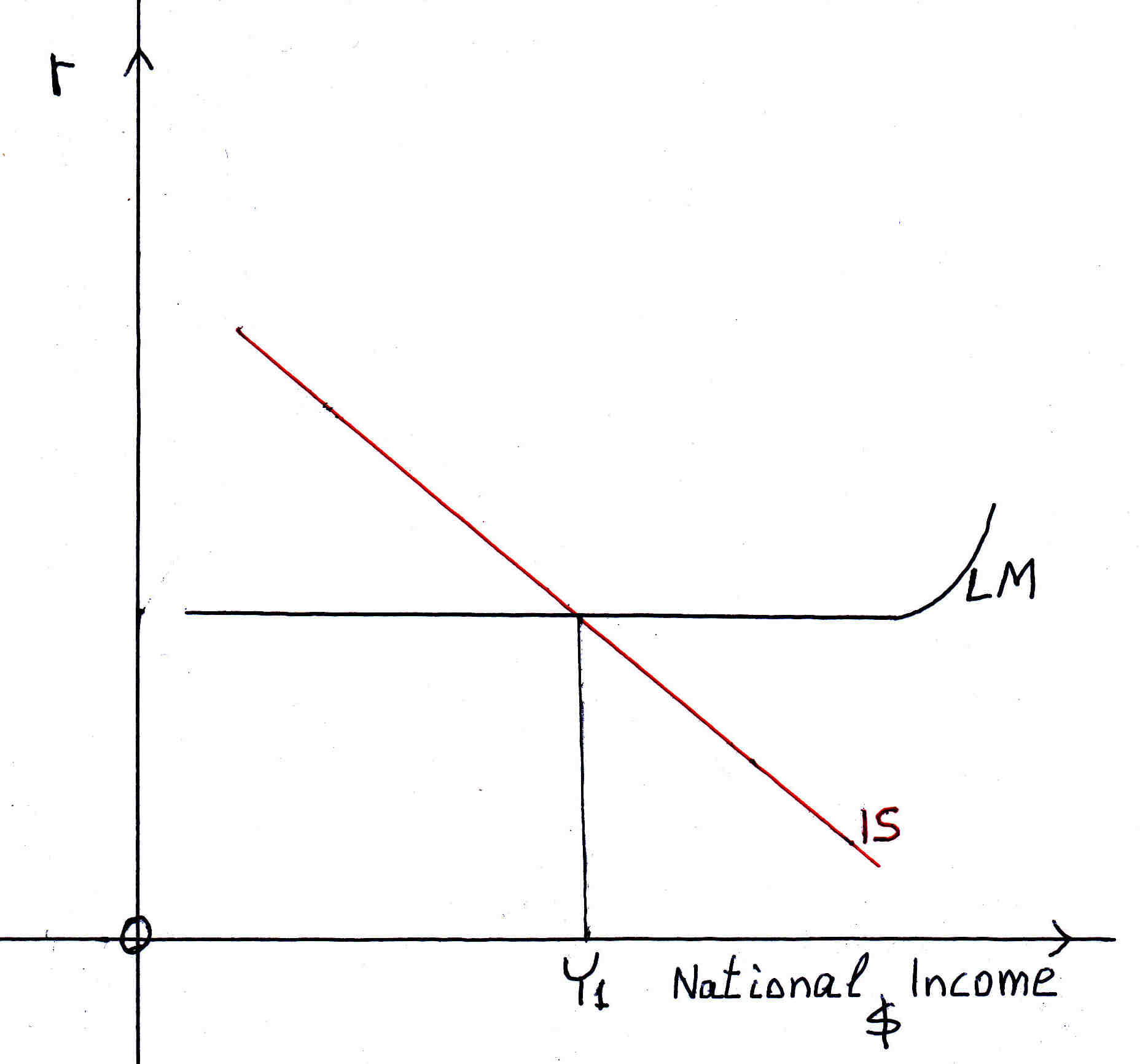 From the previous graph the rate of interest is constant thus the LM curve is flat. Therefore, national income does not change it remains the same Y1 as in the graph below.