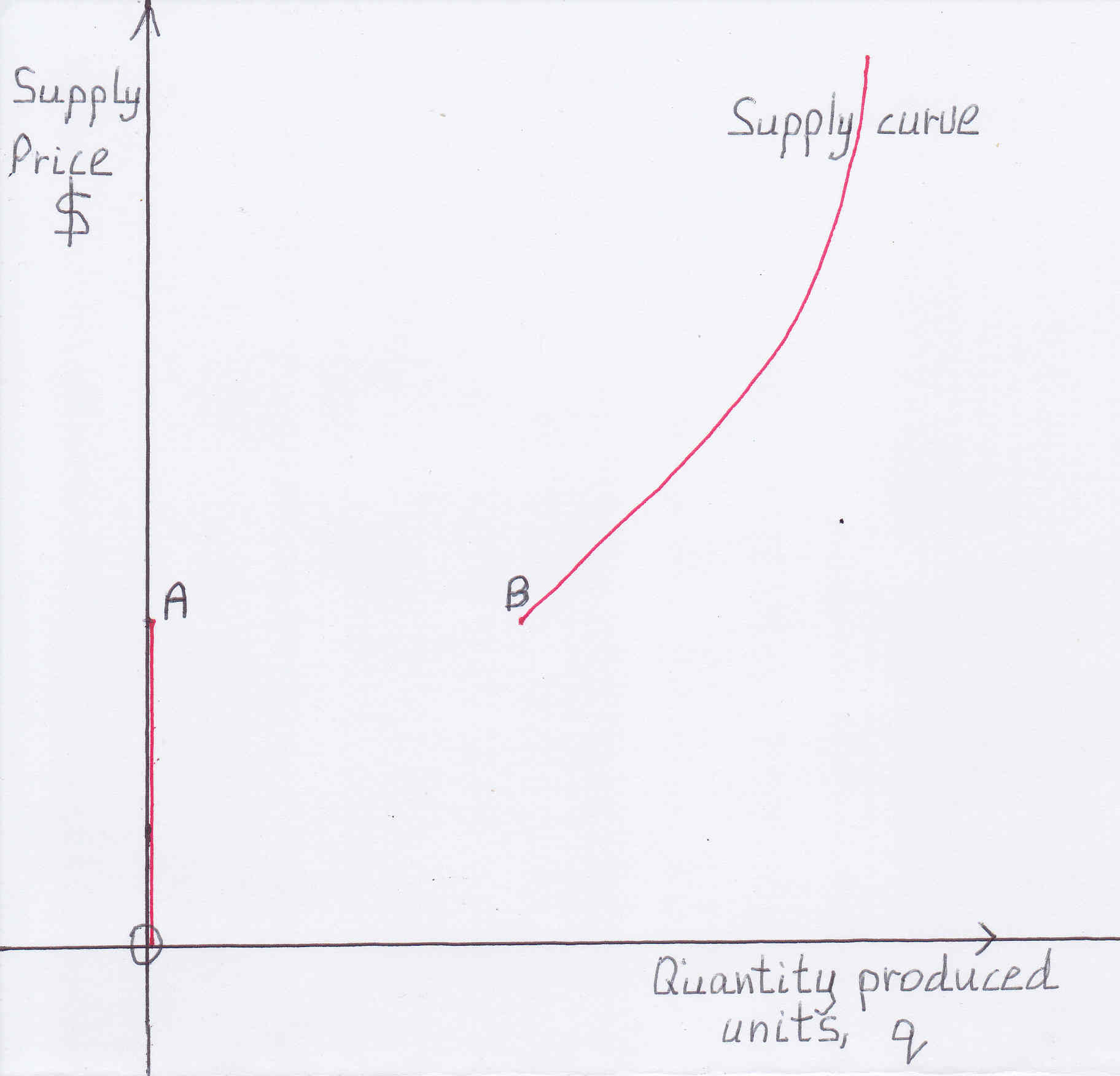 As it was previously explained the supply curve is the red line-curve (please see figure above). At price-output less than point B (less than A.V.C.) the firms close down. The supply curve is a vertical line along the vertical-axis, price-axis at output 0 until point A. Then the supply curve is the curve from point B onwards.