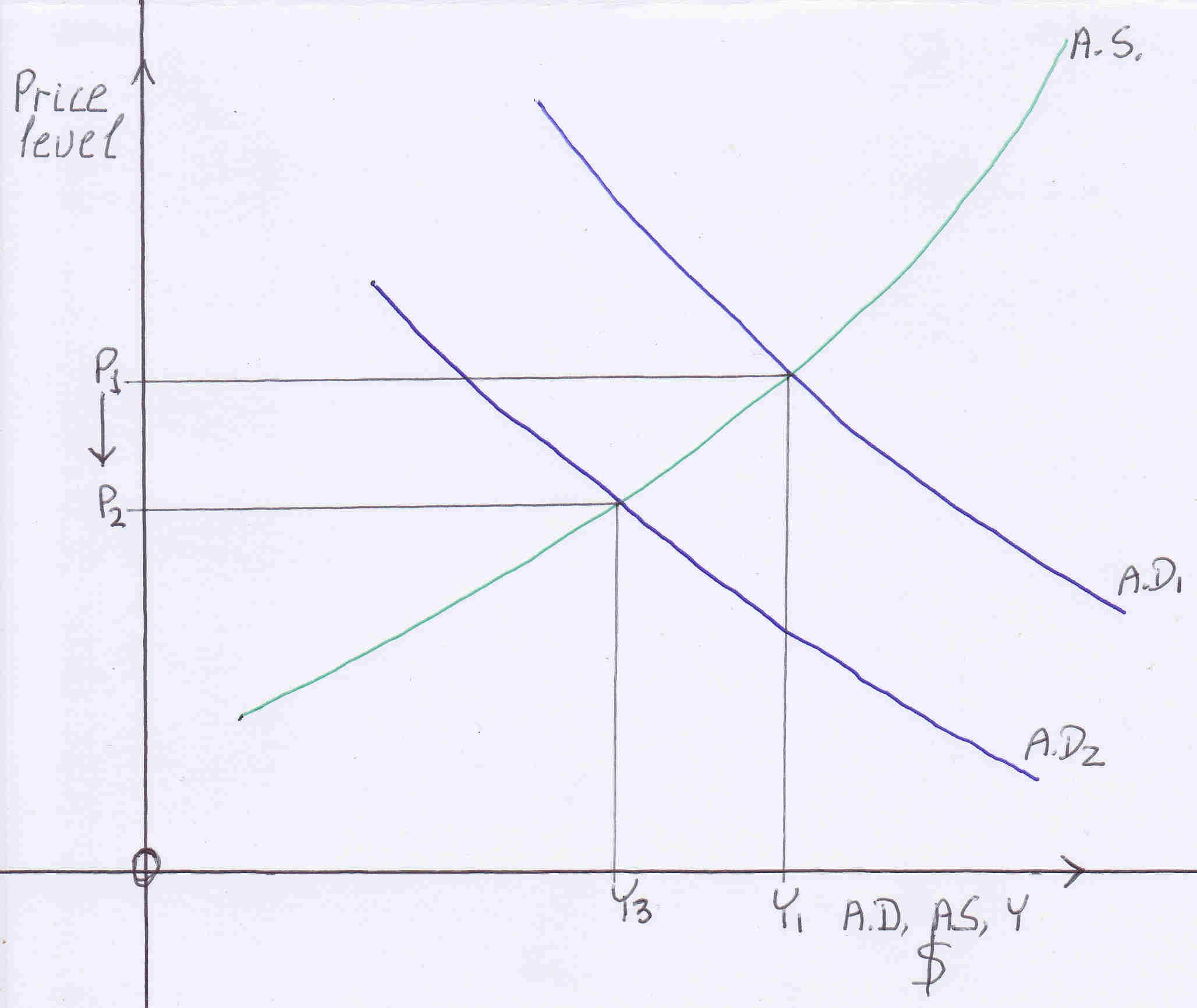 Government spending is reduced consequently aggregate demand is reduced, shifts down reducing Y to Y3.
