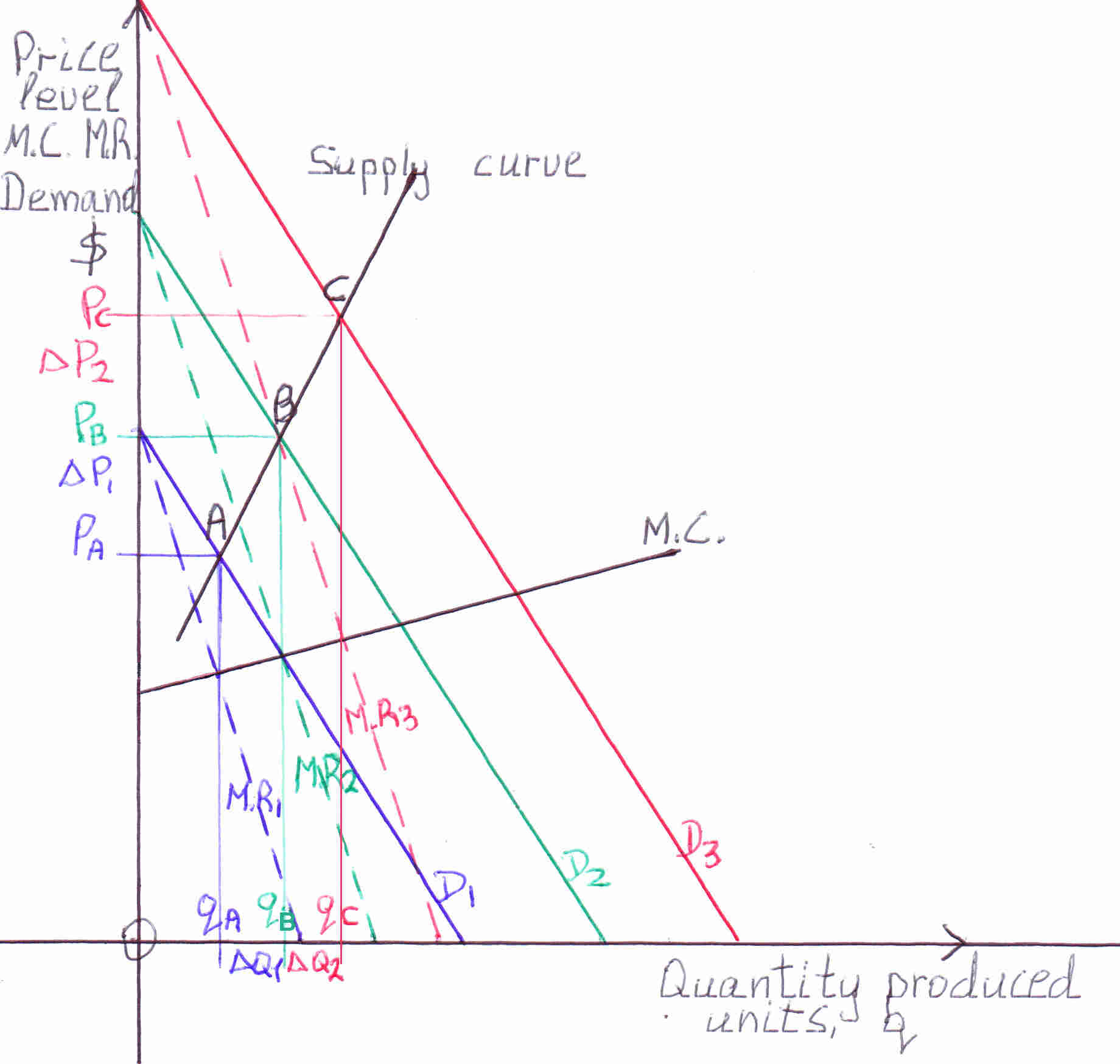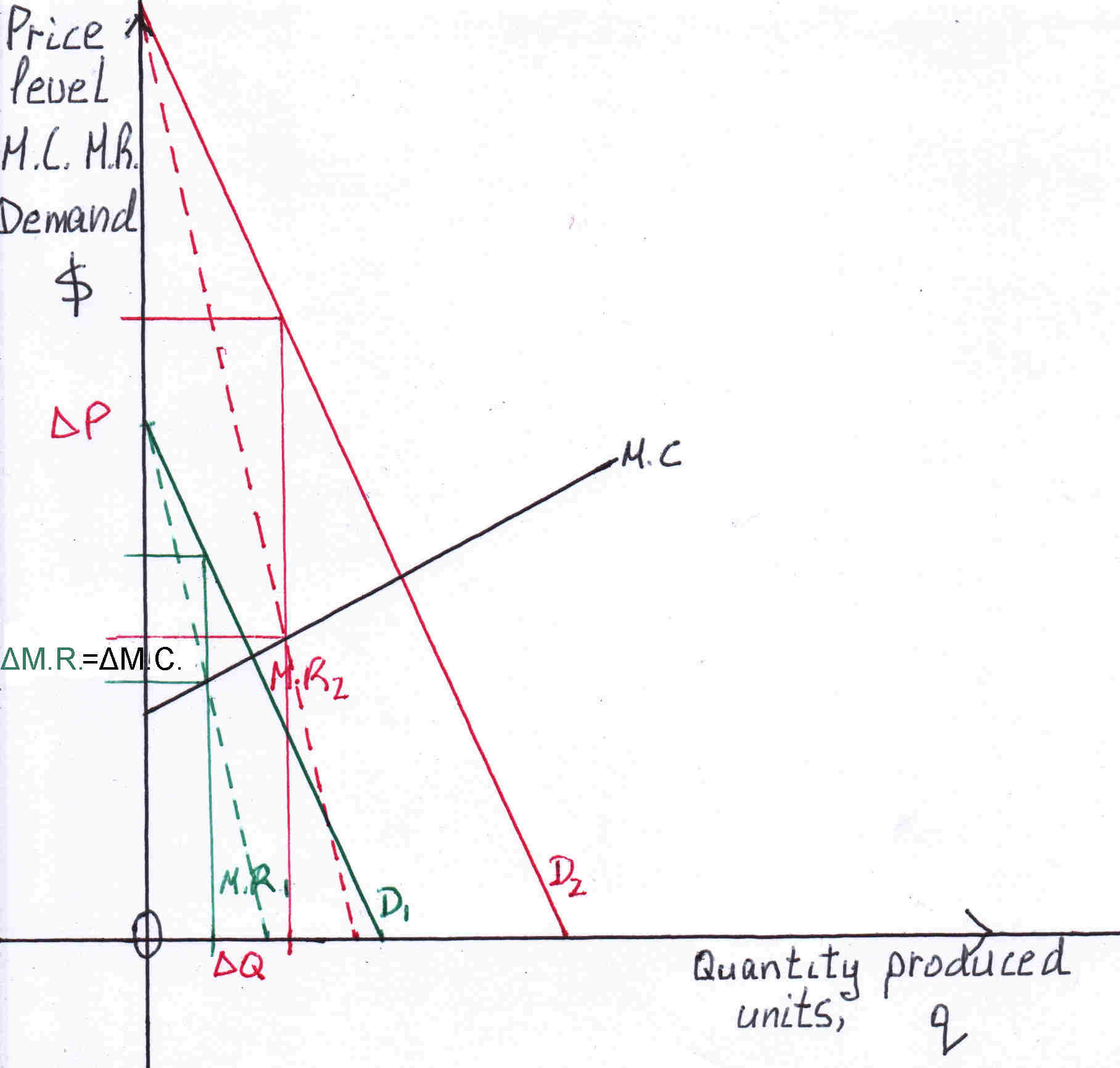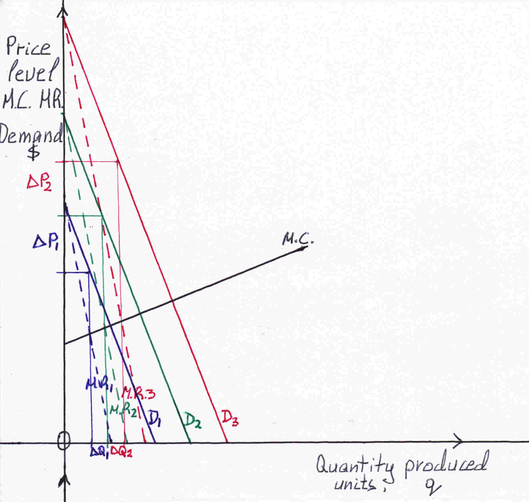 The monopolist produces that output where M.C.=M.R. to maximize profit as it was explained. From the graph above you can see the output determined is at the intersection of the M.C. curve (black line-) and the M.R.1, M.R.2, M.R.3 curves (dotted lines). The monopolist sets the price at which consumers are willing to pay at the determined output the demand curves D1, D2, D3. Where the output meets the demand curve we get the price. From the above graph you can see that the change in quantity ΔQ increase is less than the change in price ΔP (increase). The price compared to quantity increases at a larger rate.