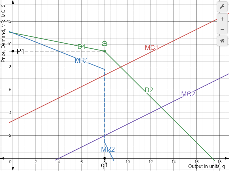 Since the two curves end and begin above each other we connect them with a vertical line to make them one curve. At Y=19.704 pc is included and Price drops slightly because goods and services in pc have lower Price than Monopoly, Monopolistic Competition and Oligopoly at Y<19.704 please see equations.When A.D. increases